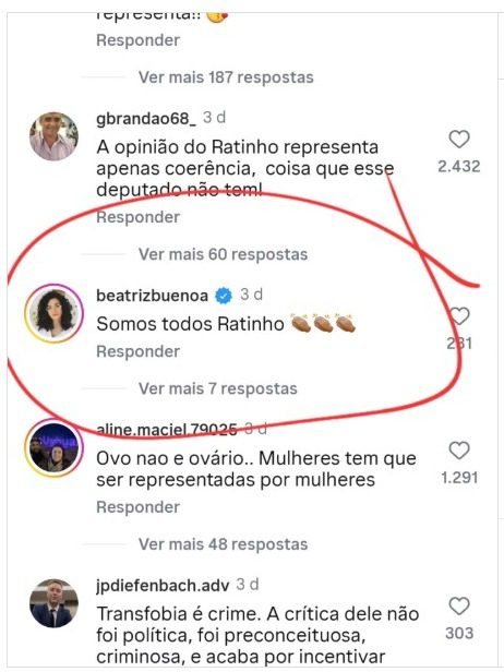 A postura de Beatriz Bueno também foi criticada por jornalistas e ativistas nas redes sociais. Em uma publicação, a jornalista Ana Mielke afirmou que a defesa do apresentador revela “camadas invisibilizadas” no debate público. “Sair em defesa do Ratinho, que ao longo de décadas utilizou uma concessão pública de TV para destilar ódio de classe, gênero e raça, não é algo condizente com a defesa de Direitos Humanos”, escreveu.