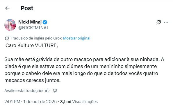 Em uma das postagens, Nicki Minaj disparou: “Caro Kulture VULTURE, Sua mãe está grávida de outro macaco para adicionar à sua ninhada. A piada é que ela estava com ciúmes de um menininho simplesmente porque o cabelo dele era mais longo do que o de todos vocês quatro macacos carecas juntos”, escreveu em seu perfil no X.