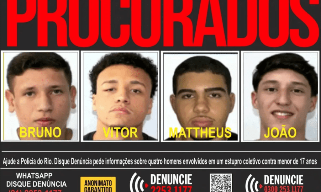 A Polícia da 12ª DP de Copacabana indiciou no último sábado (28) quatro jovens e um menor em um caso de estupro coletivo sofrido por uma adolescente de 17 anos. De acordo com a Polícia Civil, foram indiciados Bruno Felipe dos Santos Allegretti, de 18 anos; João Gabriel Xavier Bertho, de 19; Mattheus Verissimo Zoel Martins, de 19; e Vitor Hugo Oliveira Simonin, de 18.